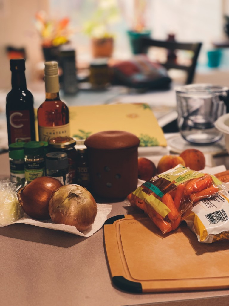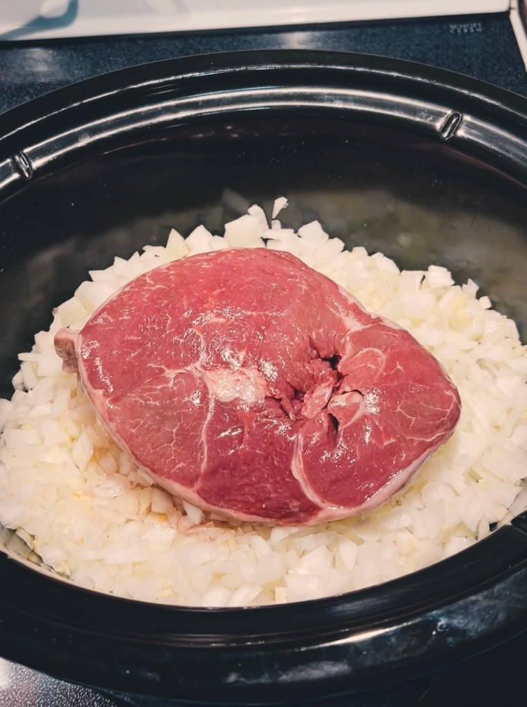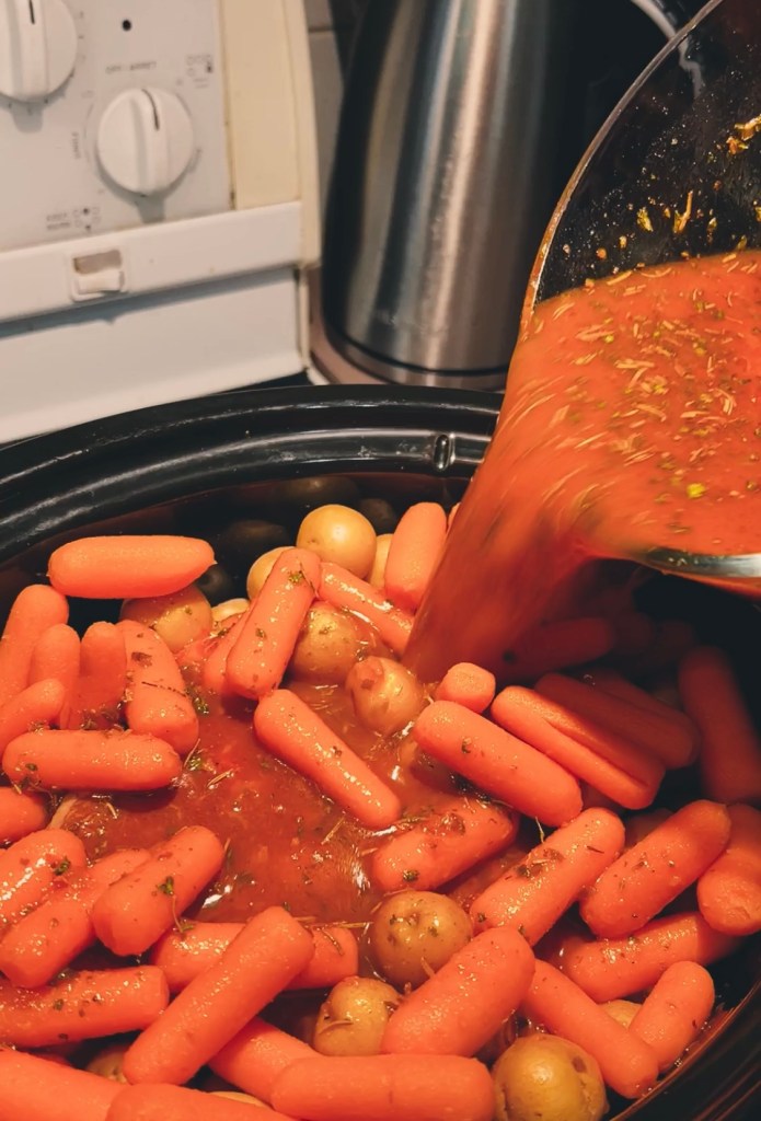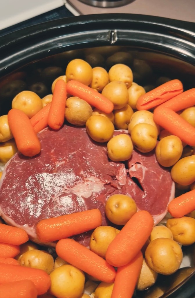 After chopping and mincing your onions and garlic, put both into the base of your slow cooker, then place your roast on top. Then you’ll want to arrange the baby carrots and potatoes around the roast.