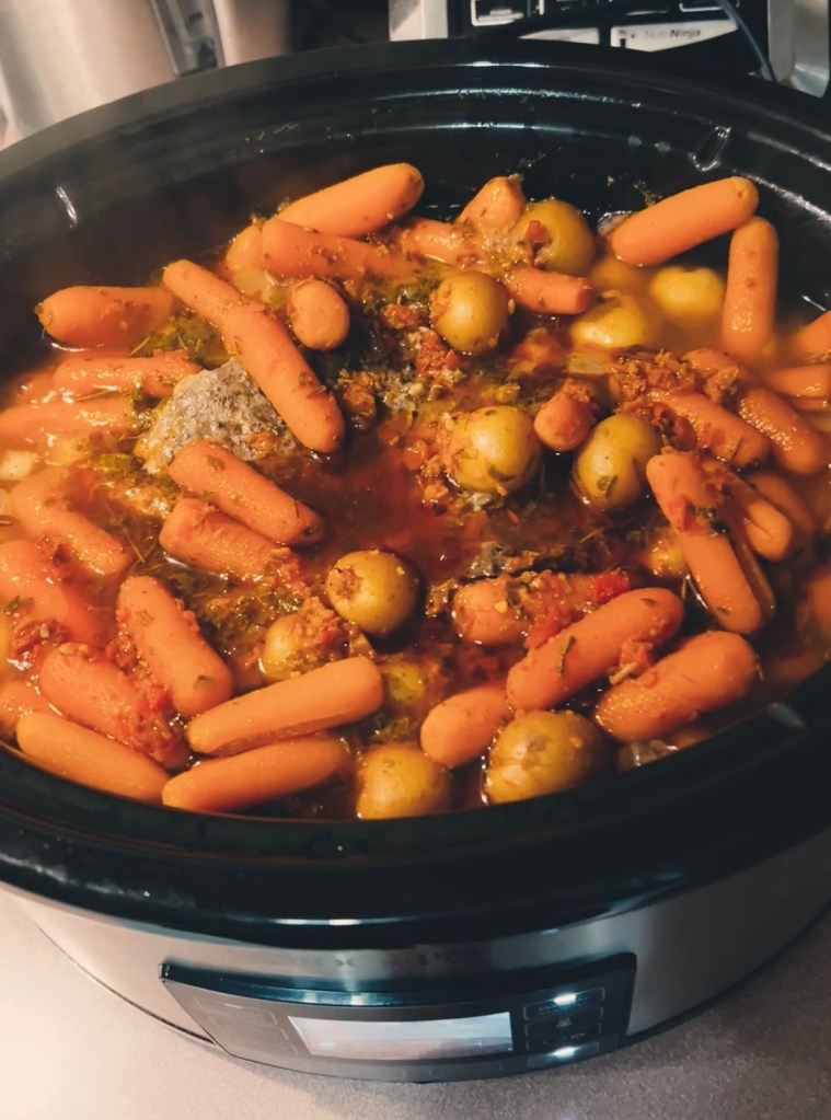 Please note I used a slightly smaller slab up meat, less baby potatoes and carrots, and a smaller jar of pesto than was recommended. My slow cooker was already filled to the brim with the ingredients I had so I think the amounts above can be adjusted based on your preference. Paré indicates the recipe is intended for a 7 quart (7 L) slow cooker.
